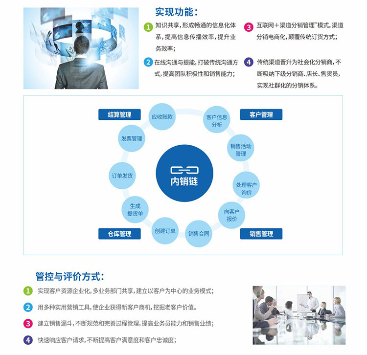 系統(tǒng)特色:實(shí)現(xiàn)360度全面了解客戶(hù),通過(guò)客戶(hù)視圖不僅可以了解客戶(hù)的基本信息、聯(lián)系信息,了解客戶(hù)的業(yè)務(wù)往來(lái)信息,對(duì)銷(xiāo)售機(jī)會(huì)進(jìn)行精確分析,甄別有價(jià)值客戶(hù),從而加強(qiáng)跟單過(guò)程控制,提升簽約率。另外銷(xiāo)售跟進(jìn)與操作評(píng)價(jià),有助于銷(xiāo)售團(tuán)隊(duì)的能力提升和潛能挖掘。