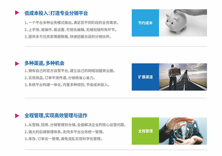 國(guó)內(nèi)營(yíng)銷(xiāo)戰(zhàn)略涵蓋:分銷(xiāo)渠道管理、級(jí)別限制、促銷(xiāo)與返利、虛擬庫(kù)存、訂單管理(審核、驗(yàn)貨、發(fā)貨、退換貨)、吞吐量分析、帳務(wù)管理、流水管理、對(duì)帳管理等。